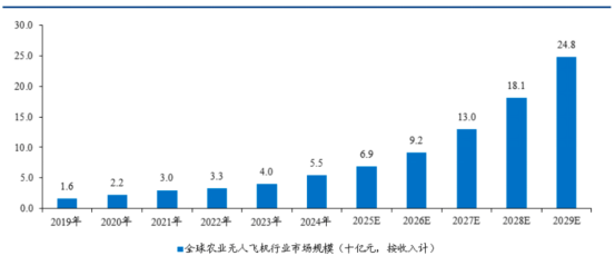 全球农用无人机市场正处于爆发式增长阶段。据弗若斯特沙利文报告,2019-2024 年全球市场规模从 16 亿元增至 55 亿元,年均复合增长率 28.8%,预计 2029 年将达 248 亿元,年均复合增长率进一步提升至 35.2%。