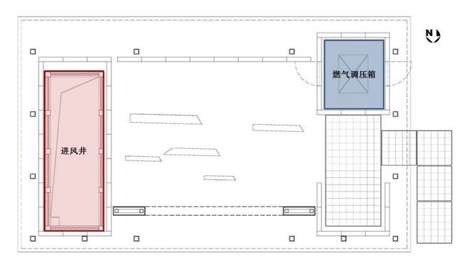 北侧社区会客厅,左侧为3.7米高的进风竖井,右侧后半部分为3米高燃气调压箱,用一组虚实结合的景观廊架将两处构筑物进行整合装饰,中部开放空间以山石松景作为北侧次入口的对景,会客厅右侧内部设有可供休憩赏玩的空间。